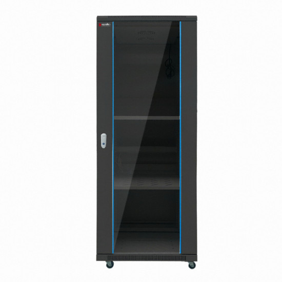 허브랙 / 강화유리 / 착탈식 / 스틸도어 / 32U / 케이즈너트 타입 / 선반:2개 / 냉각팬:2개 / 바퀴 장착
